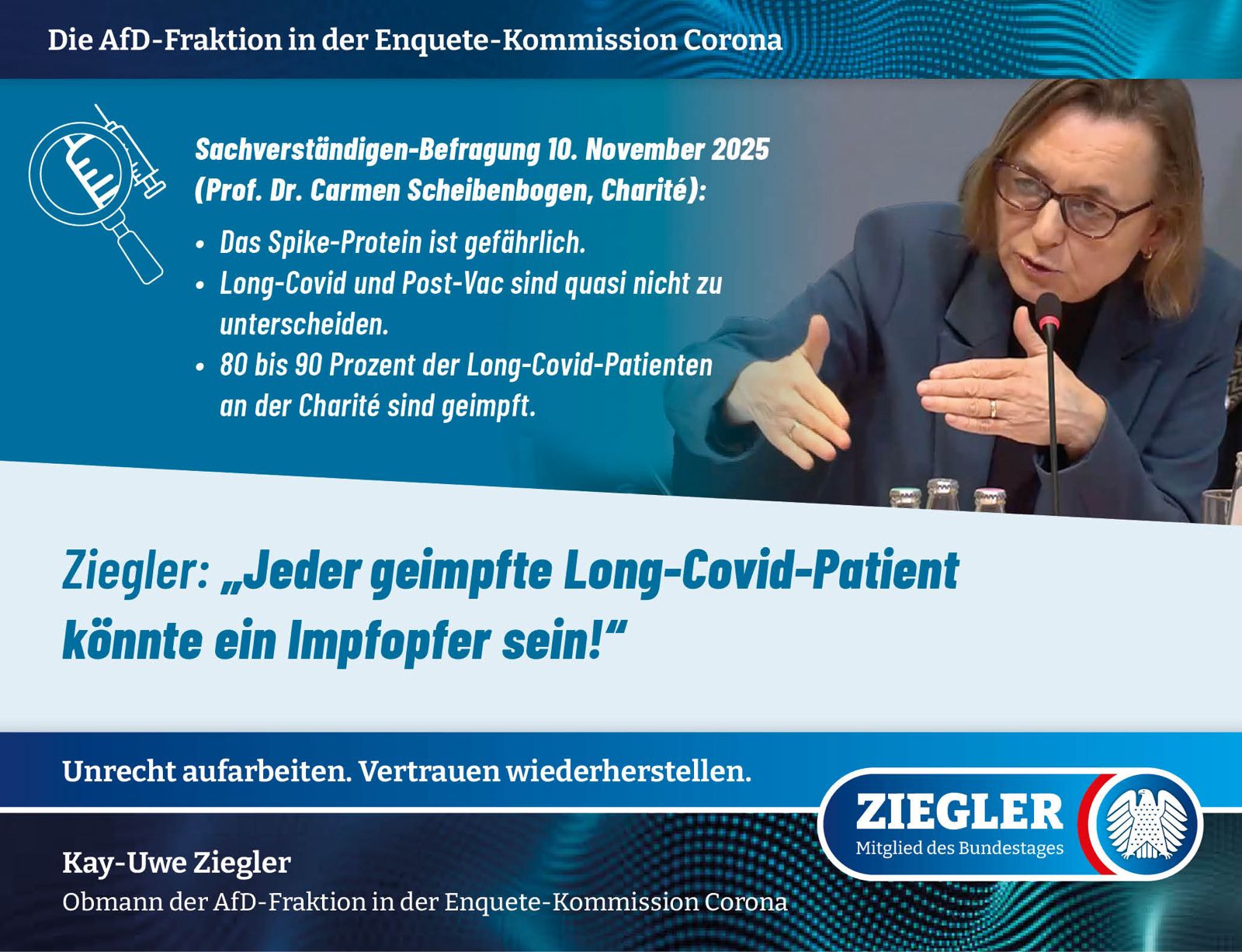 - Kay-Uwe Ziegler: „Damit könnte jeder Long-Covid-Patient auch ein Impfgeschädigter sein! Es wäre ein Skandal, wenn die Aussage der Sachverständigen nicht zum augenblicklichen Stopp der Impfung führen würde.“